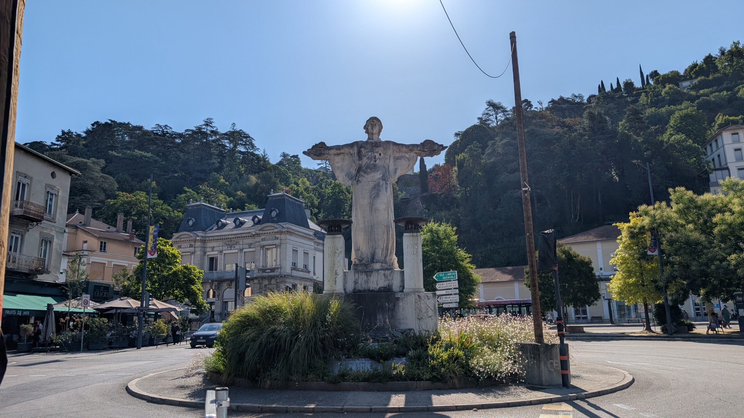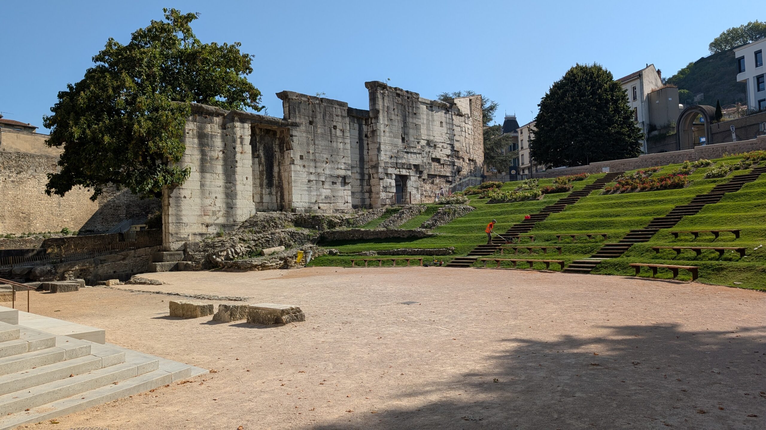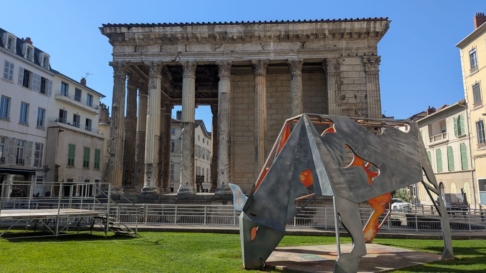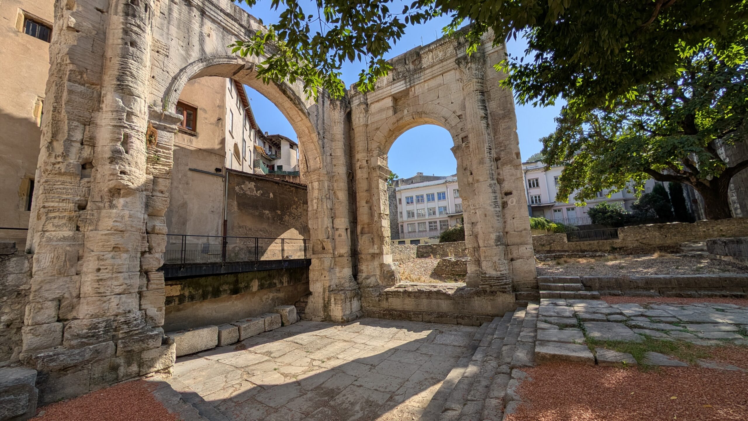 Heute Morgen sind wir dann aufgebrochen, um einen Spaziergang in Vienne zu unternehmen. Die Kleinstadt hat mit seiner über 2.000 Jahre alten Geschichte ein römisches Erbe: von Julius Cäsar im Jahr 47 v. Chr. wurde es zur römischen Kolonie („Colonia Iulia Viennensis“), später wurde es zu einer der bedeutendsten Städte im römischen Gallien, Sitz eines römischen Gouverneurs und Verwaltungszentrum. Es gibt ein römisches Theater (ca. 10.000 Plätze – eines der größten römischen Theater nördlich der Alpen), den Tempel von Augustus und Livia aus dem 1. Jahrhundert n. Chr. (einer der besterhaltenen römischen Tempel Frankreichs) und etliche weitere Reste aus der römischen Bauzeit.